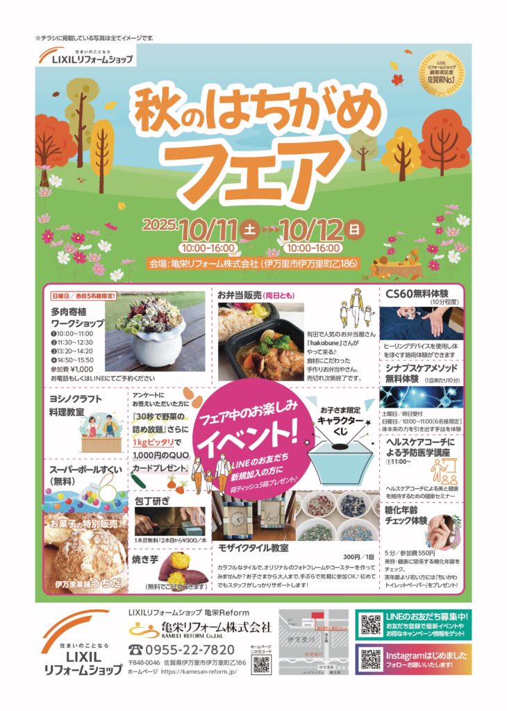 update 2025/09/19 ☆秋のはちがめフェア開催☆ 10月11日(土)~10月12日(日) 秋のはちがめフェアを開催いたします。 この機会にリフォーム工事や、家のお困りごとなどお気軽に相談ください。 皆様のご来場をスタッフ一同、心よりお待ちしております。 ☆9月のお休みのお知らせです☆ ☆ピラティス教室生徒さん募集☆